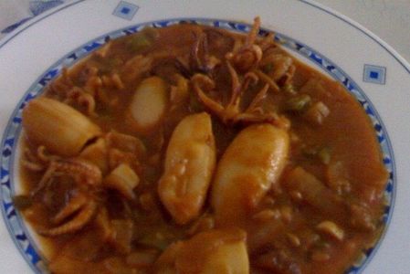 - Pon la mariposa en el vaso y añade los calamares , el laurel, el comino, pimienta negra, y la cucharadita de pimentón. Programa 5 minutos, temperatura varoma, giro a la izquierda, velocidad cuchara.